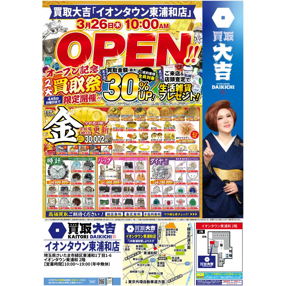 【さいたま市緑区】新規オープン!イオンタウン東浦和店に「買取大吉」ができる♪ 買取UPキャンペーン中【買取大吉 イオンタウン東浦和店】